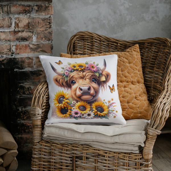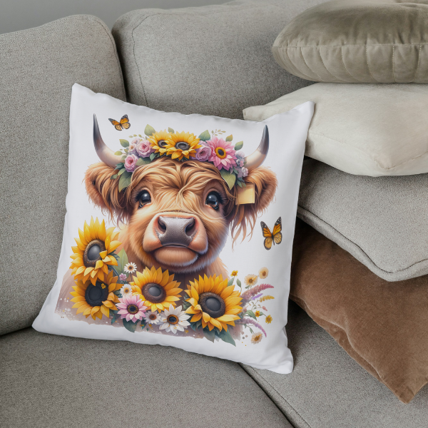 The Cute Sunflower Highland Cow Throw Pillow is a delightful and unique addition to any living space, offering a charming blend of rustic charm and floral beauty. This throw pillow features an adorable Highland cow, known for its distinctive long horns and shaggy coat, adorned with or surrounded by cheerful sunflowers. The result is a whimsical and inviting design that brings a touch of the countryside into your home, making it a perfect accent piece for your couch, bed, or favourite chair.
