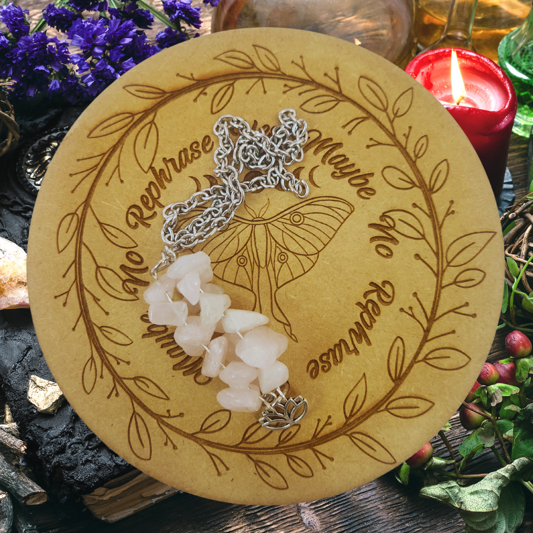 Together, rose quartz and the lotus create a pendulum that radiates calm, loving energy and supports: