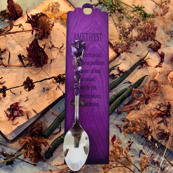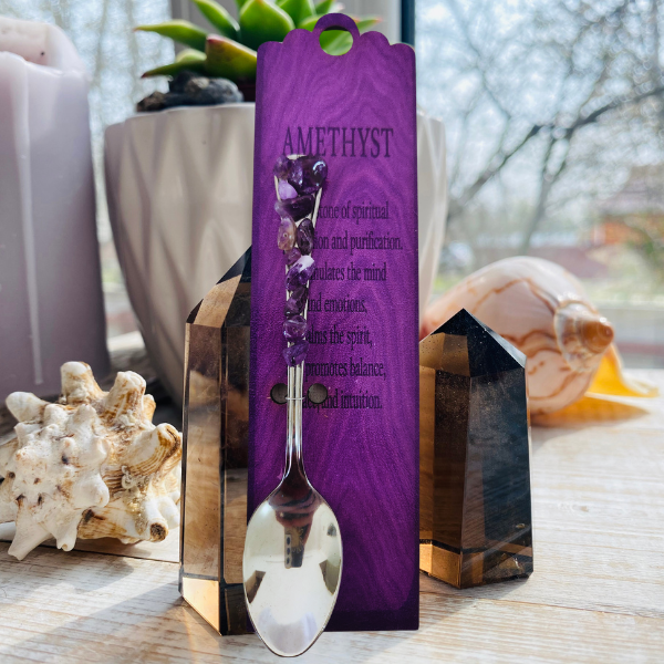 Each spoon is unique due to the natural variation in Amethyst stones.