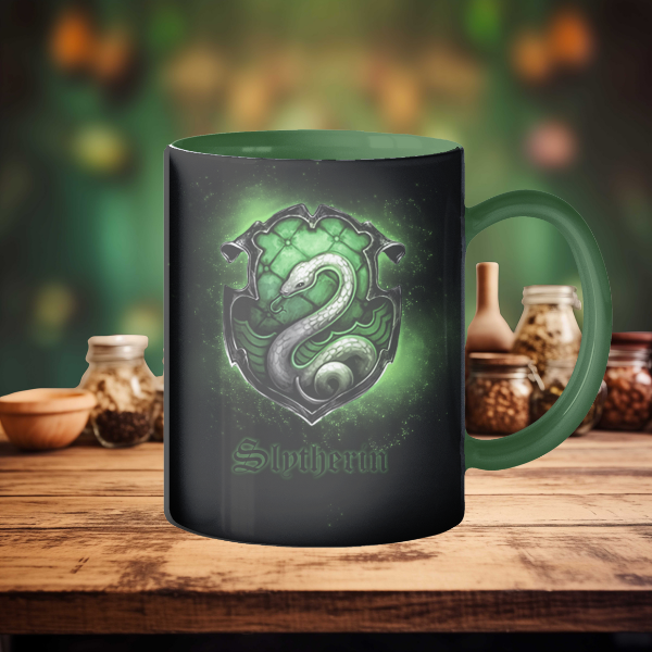 Showcase your ambition, cunning, and resourcefulness with this Slytherin Themed Dark Green Mug. With a deep green handle and matching interior, this 11 oz ceramic mug captures the cool, confident essence of the Slytherin house.