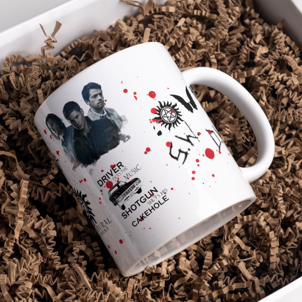 Start your day like a true hunter with this Supernatural inspired 11oz coffee mug, designed for fans of the iconic TV series. Featuring artwork inspired by the Winchester brothers, the Impala, and classic hunter symbols, this mug captures the dark and legendary energy of the show.